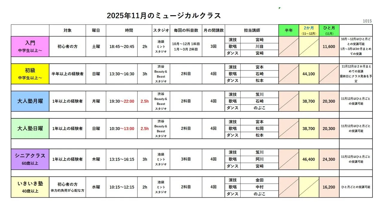 2025年11月からの各ミュージカルクラスの受講生、予約開始