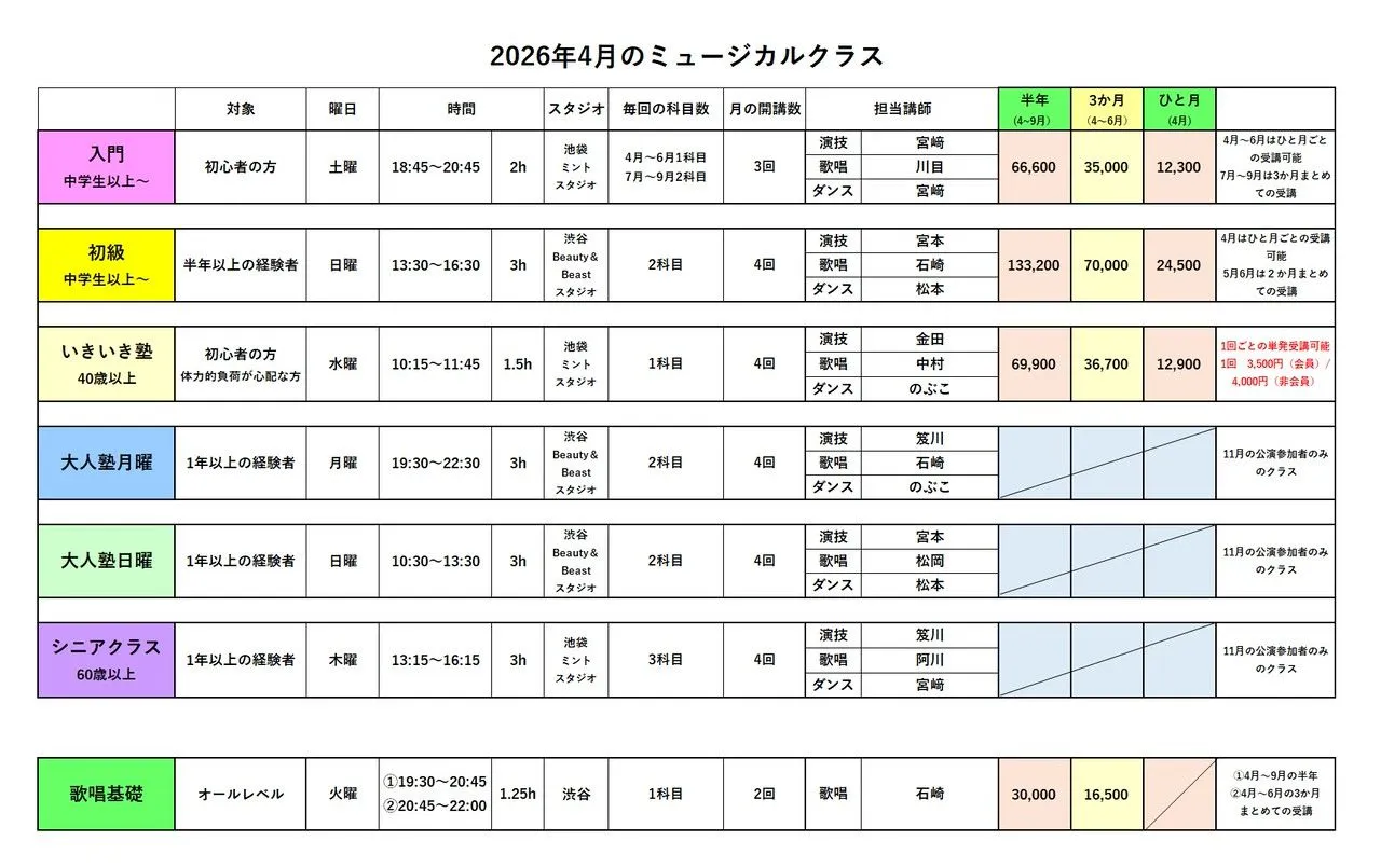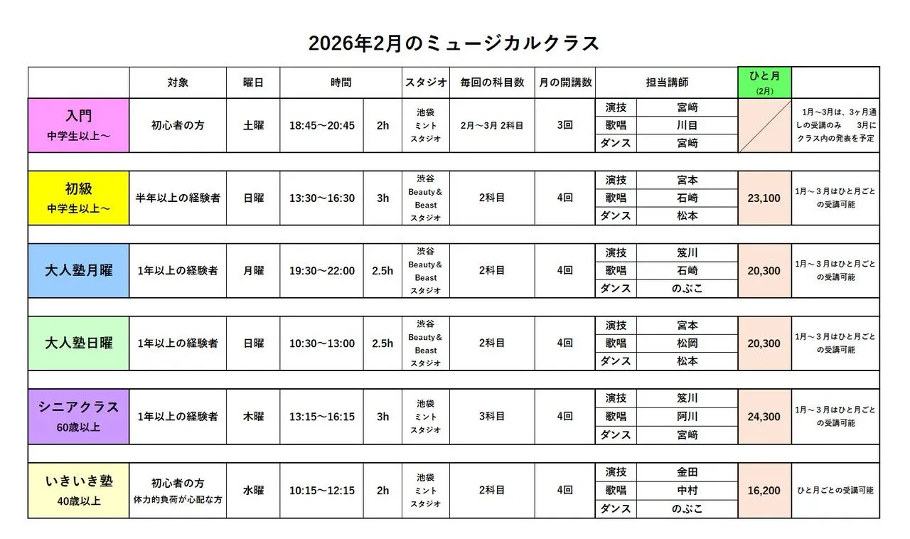 2026年1月からの各ミュージカルクラスの受講生、予約開始