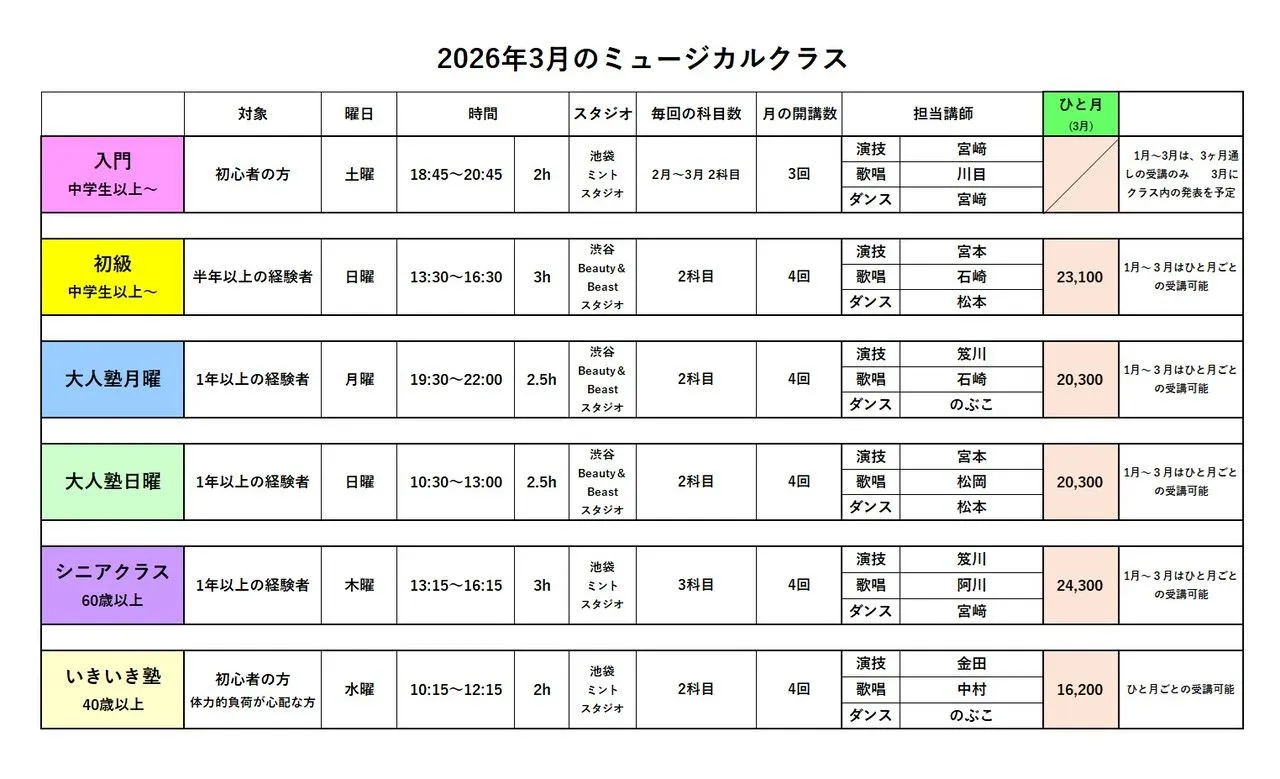 2026年3月からの各ミュージカルクラスの受講生、予約開始